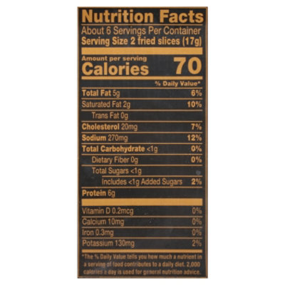100 g 2 pan fried slices 150 g 1 g 1 ounce 283495 g 1 pound 453592 g 1 kg 1000 g custom g custom oz. 2 fried slices 15 g Amount Per Serving. 2 slices 13 g Amount Per Serving.
